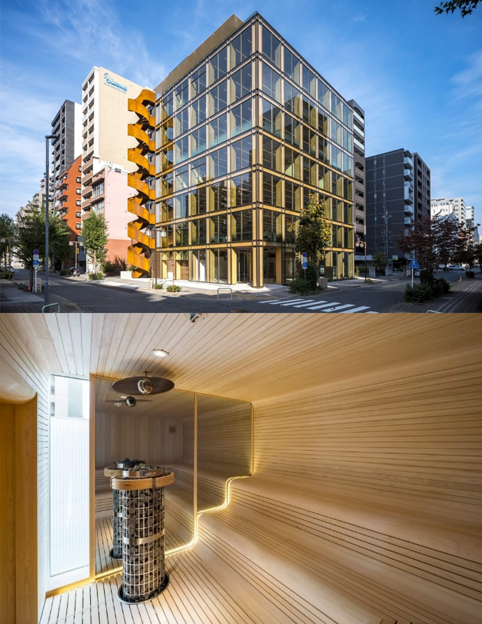 8階には、日本で初めて駐日フィンランド大使に認定されたオフィスサウナ『LUOVA SAUNA』(ルオヴァ・サウナ)があります。設計は、ビルと同じく世界的建築家・坂 茂(ばん しげる)氏によるもので、社員が終業後のリフレッシュや休日のレクリエーション、お取引先との商談などに使用しています。サウナを通した社員の健康およびワーク・ライフ・バランスとウェルビーイング向上のための取り組みをご評価いただき、2021年11月に日本で初めてフィンランド大使からオフィスサウナとして認定いただきました。