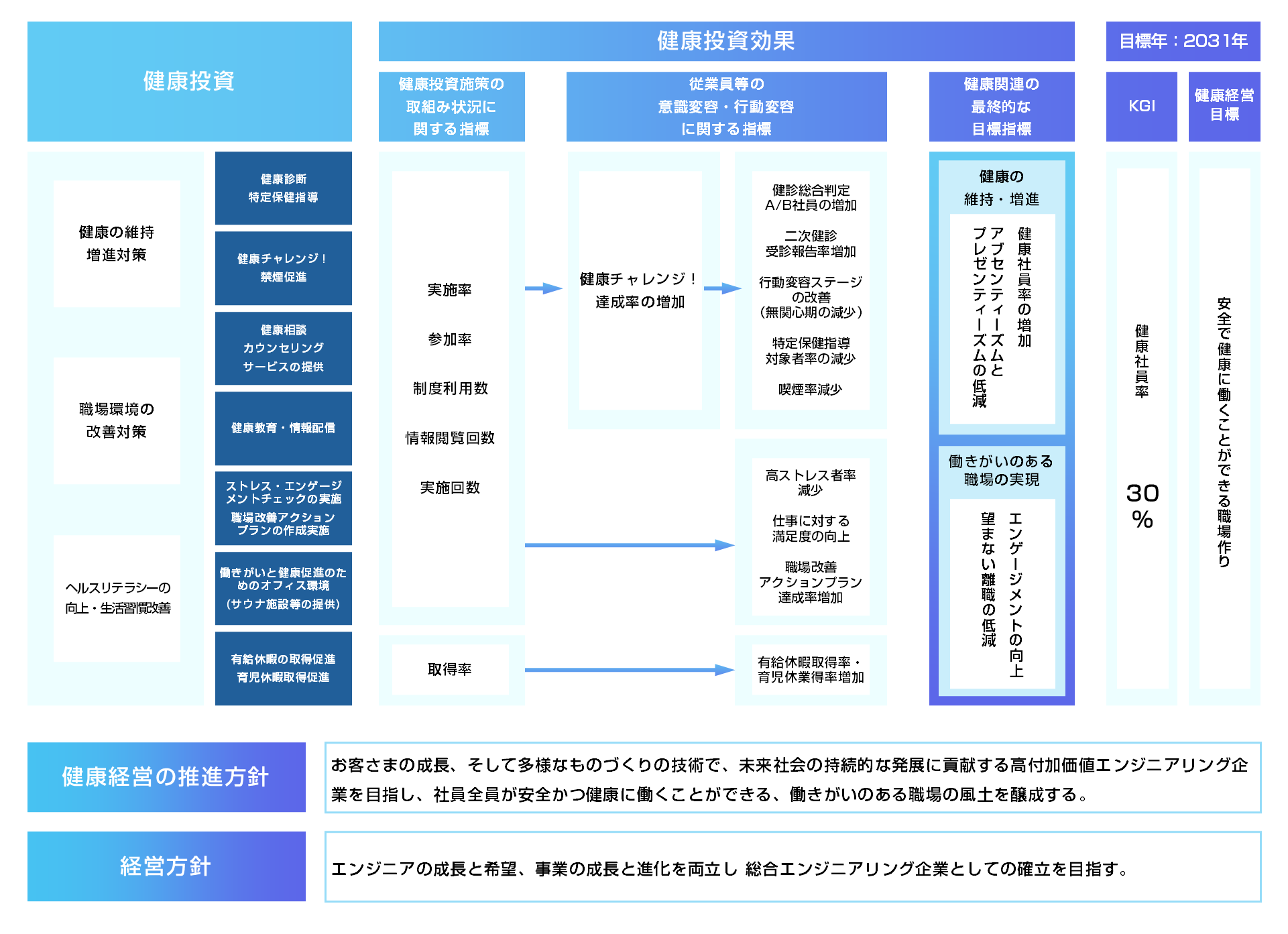 これら高付加価値な技術サービスを持続的に提供するためには、従業員とそのご家族の健康が何よりも重要であり、会社にとっても重要な財産であると捉え、2017年より私を「社員の健康保持・増進最高責任者」とし、積極的に健康経営を推進しております。
