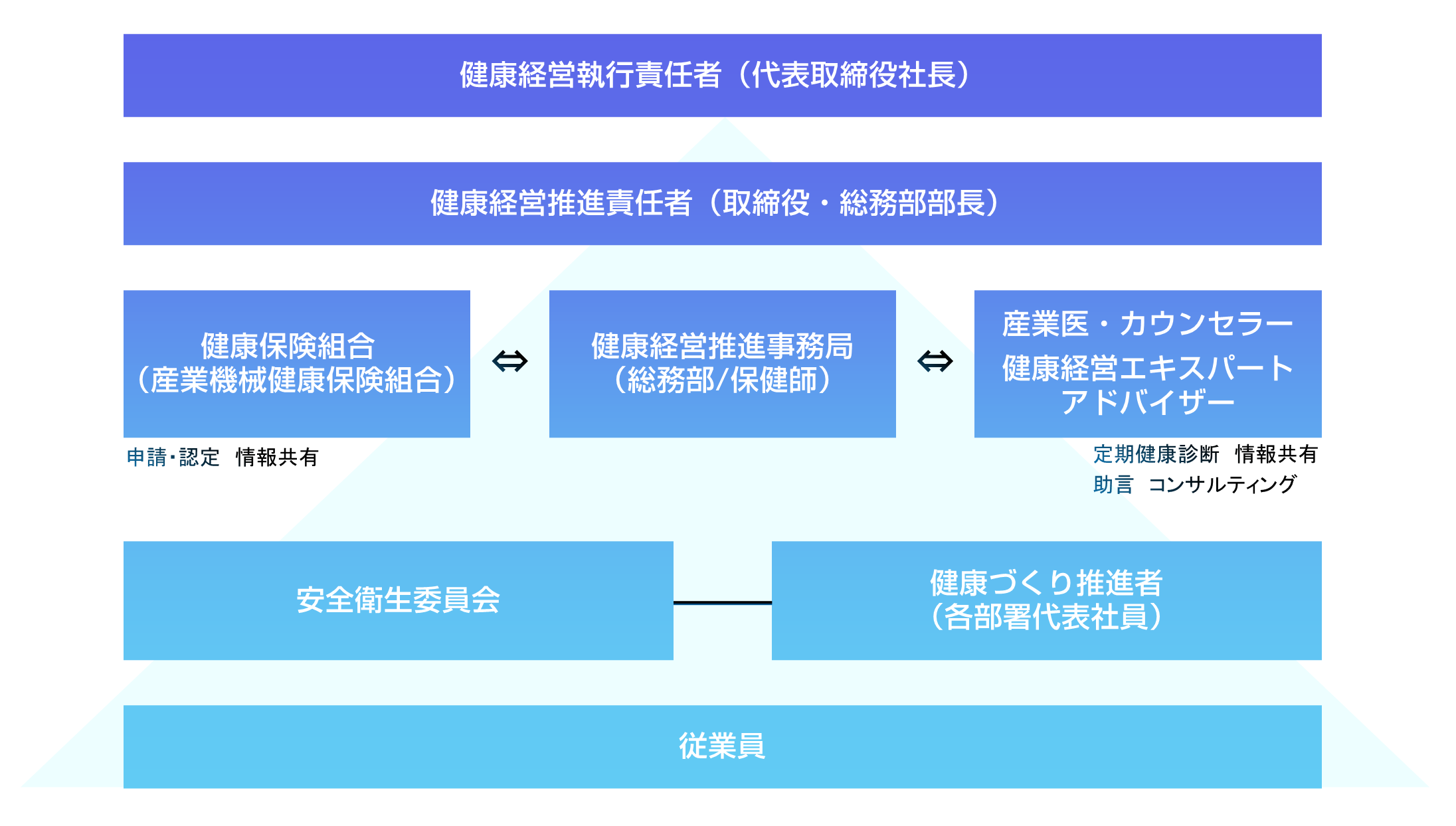 そのために、代表取締役社長 森實 敏彦を「社員の健康保持・増進最高責任者」とし、社員全員が安全かつ健康に働くことができる、働きがいのある職場の実現を目指します。